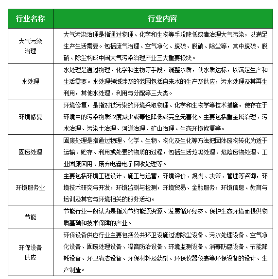 本次盤點的環保公司為上海A股、深圳A股上市的環保企業,包括主板、中小板和創業板,共計93家。根據每個公司占比最大的主營業務不同,我們將這些公司分為大氣污染治理、水處理、環境修復、固廢處理、環境服務、節能、環保設備供應七個細分行業,具體如表1所示。